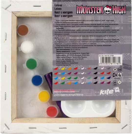 Комплектация: холст с контуром для рисунка, акриловые краски, кисточка, палитра для смешивания красок, инструкция