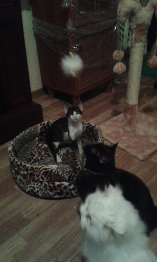 Лапка поправилась)) Мордочка уже округлилась,подросла- хорошенькая.Лапка охотник за хвостиками)))