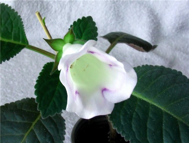 Очень нежная,с желтым горлышком. Растение молоденькое совсем, естественно и цветочек пока мелкий.