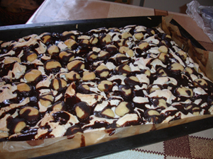 Печенье макаем в молоко и выкладываем 2х2 ,потом слой массы толщиной не больше 5-7 мм , и так чередуем слои,пока не закончится печенье). Еще можно всю эту красоту полить расплавленным шоколадом(я взяла белый). В холодильник на пару часов.