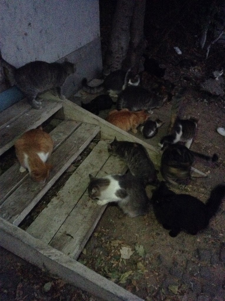 Вчера с подругой покормила этих котиков. Пришли мы туда, когда уже начало темнеть, никого поначалу не увидели, но стоило сказать кис-кис..