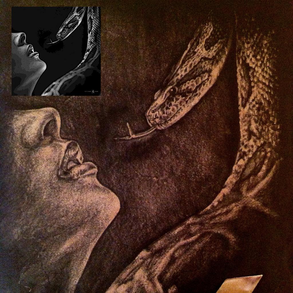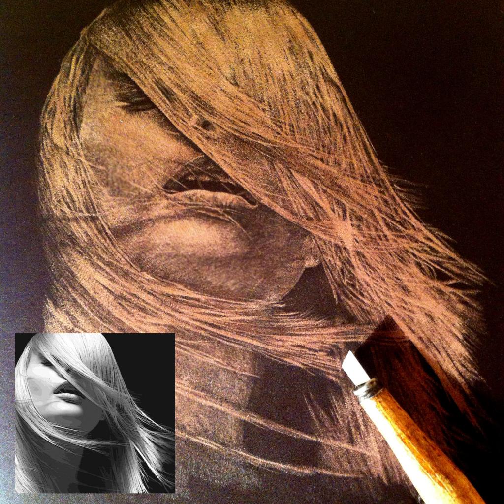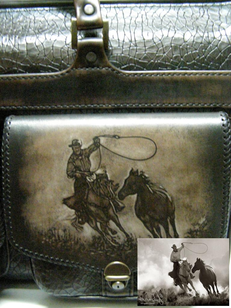 Никакого лазера! 100%-ная ручная работа! Только кожа и ножи! Спецификой данного вида искусства является точное соскабливание верхнего слоя кожи, балансируя на пороге тонов и полутонов , до получения реалистичного , фактически фотографического изображения .