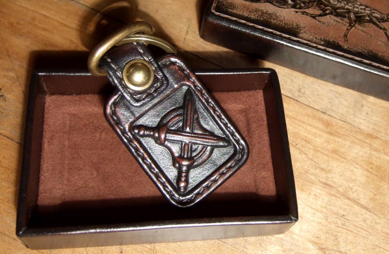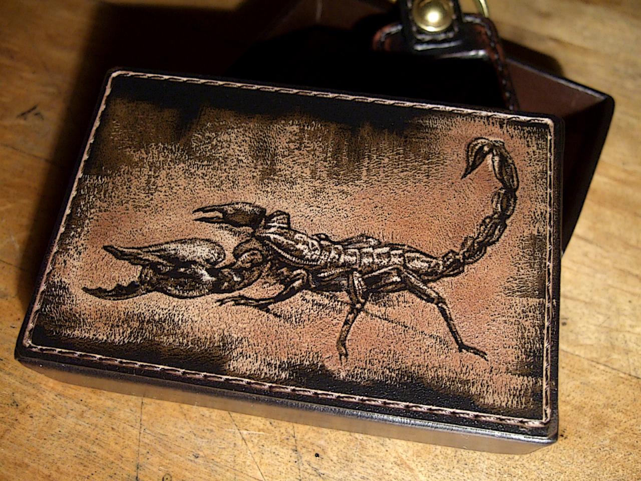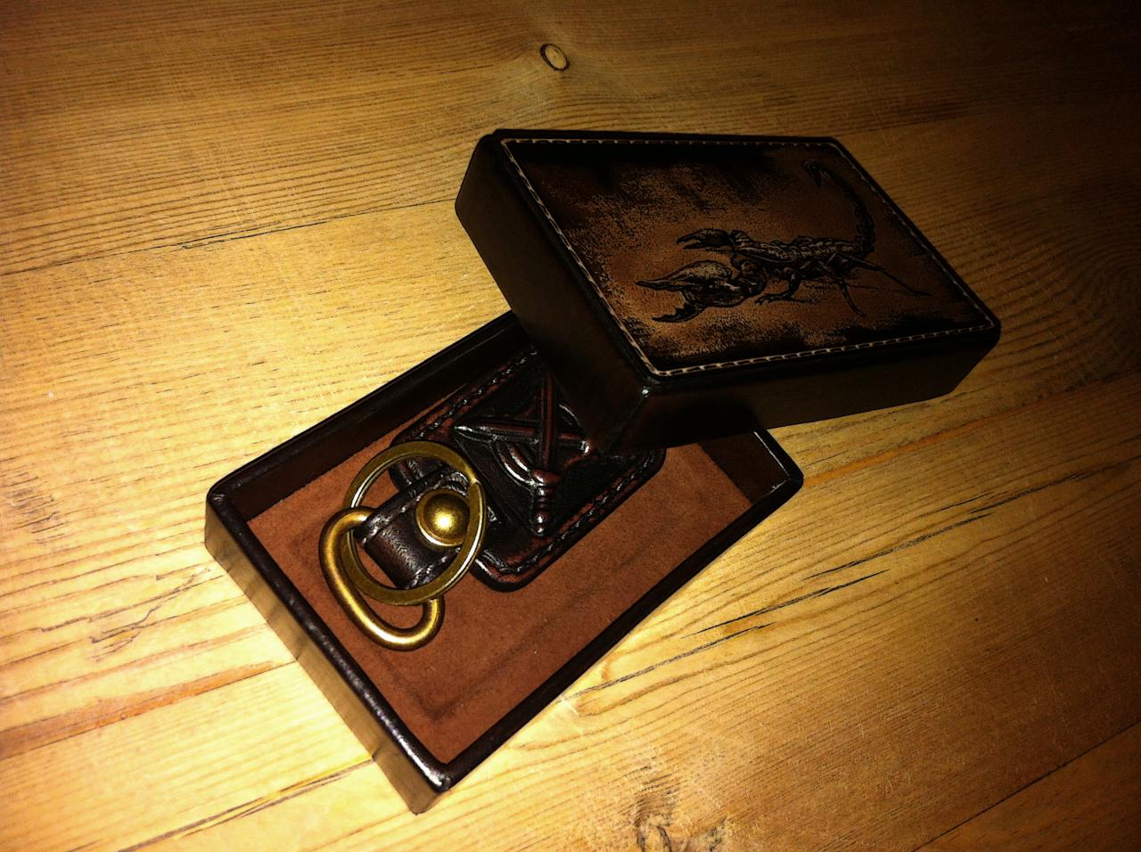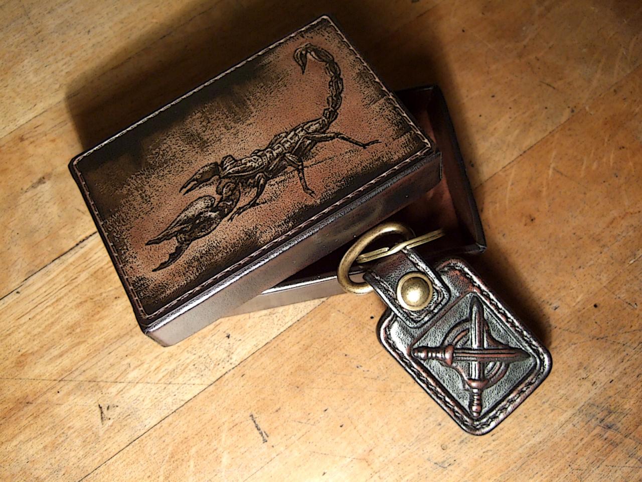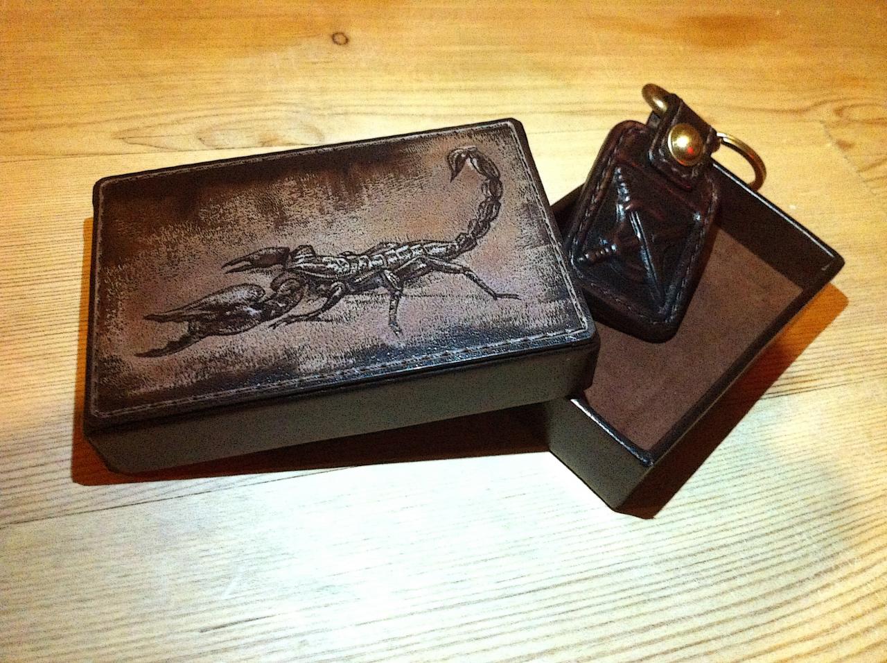 Коробка (7х10х2,5см.) Изготовлена полностью из кожи! Внешняя поверхность из гладгой кожи, внутренняя из благородной замши. Верх крышки коробки декорирован ручной гравировкой кожи. Скорпион не случайный выбор, а знак зодиака одариваемого