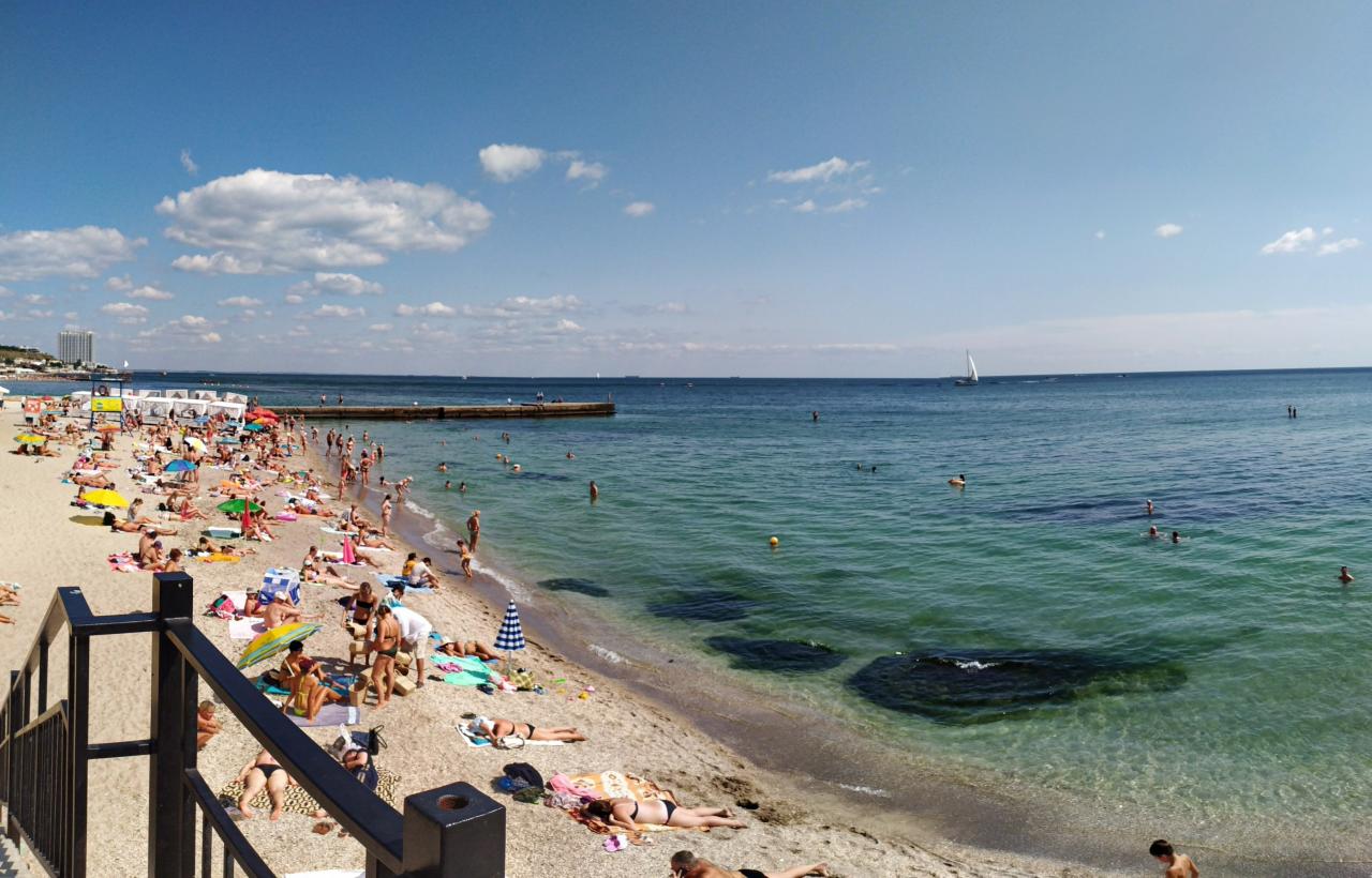 10-я ст. Б .Фонтана. Море немного прохладное, если заходишь глубоко. А так водичка теплая. Но водорослей полно. Людей на пляже много.