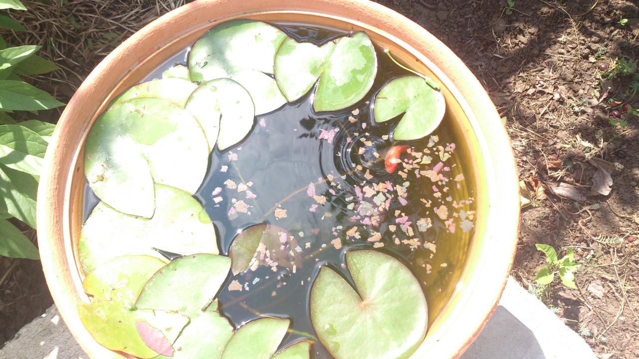 Мой мини-прудик с золотыми рыбками)))) есть еще одна серебристая и 2 гуппи, но их фотик не ловит. Продолжает радовать и украшать угол сурфиния
