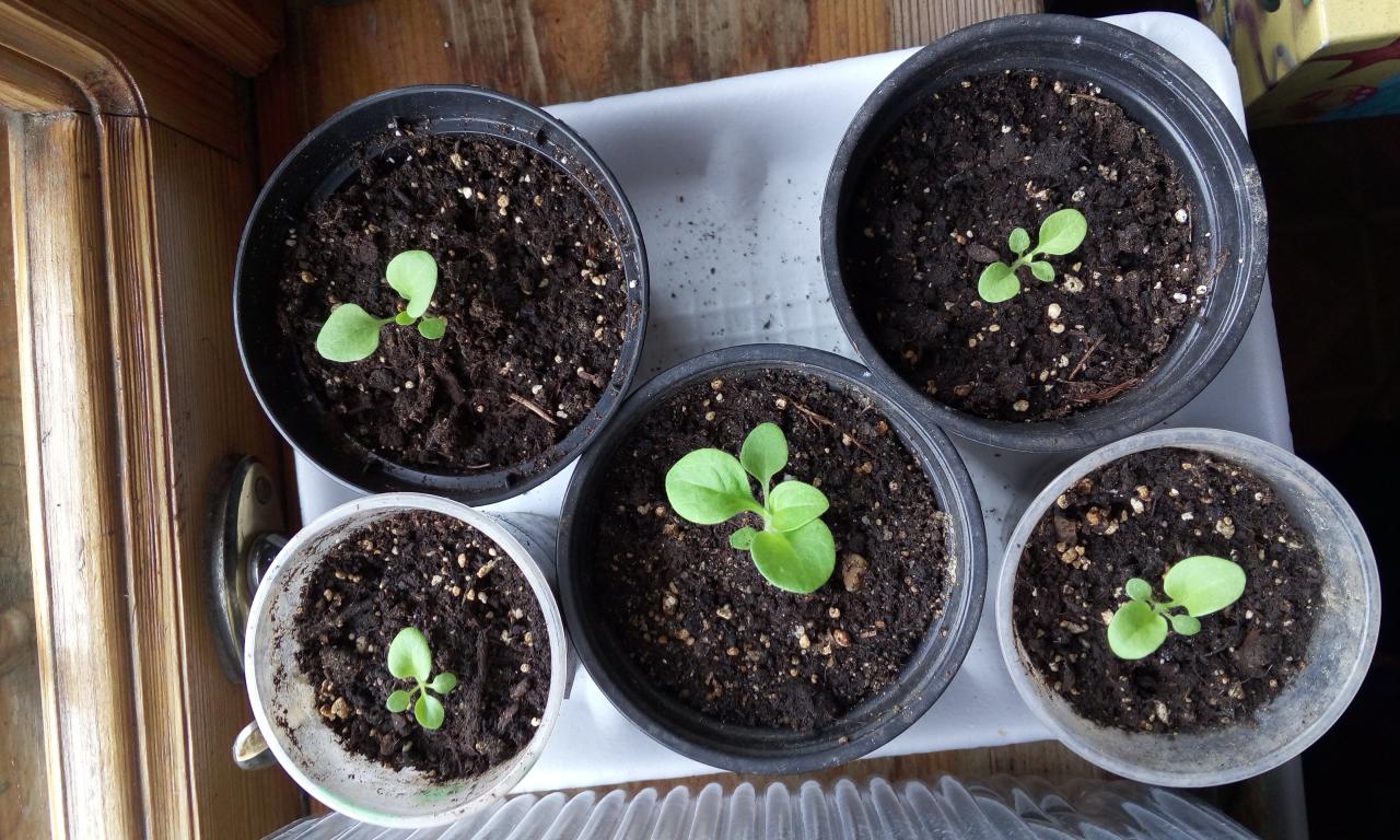 Не прищипывала, это ампельные - они кустятся сами. Посеяла Даймонд Перли, Рамблин, Парпл Вельвет, Супермахровая Бриллианты и Жемчужины, Салмон Вельвет. Пока лучше всех выглядат: Даймонд Перли - у них самые длинные боковые побеги, плюс кустики компактные; Рамблин - очень приземистые кустики. А вот Салмон Вельвет выпустил длинный центральный побег (боковые тоже есть, но пока центральный как-то на их фоне выглядит вытянувшимся).
