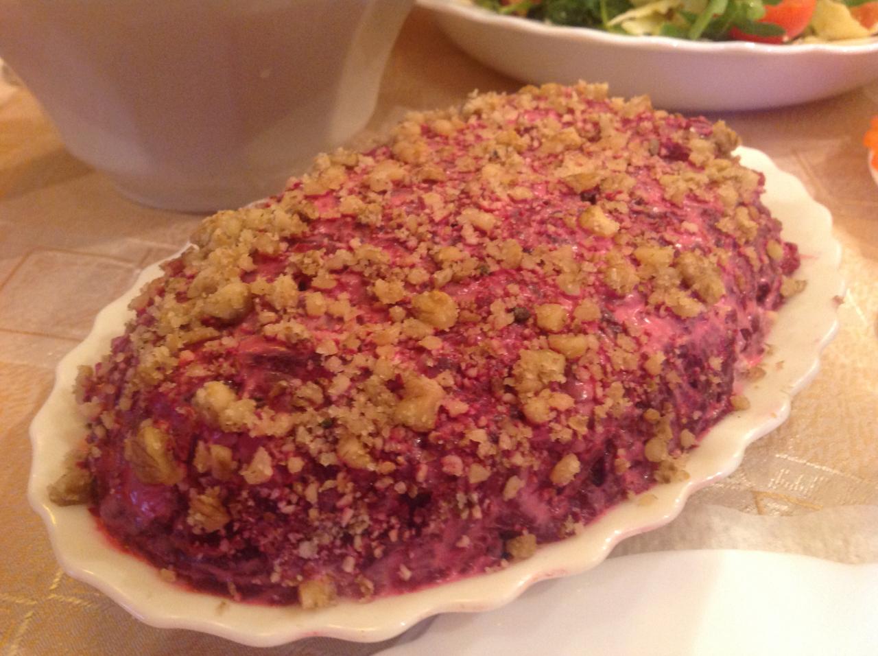 3. Вегетарианская шуба: 100 г. адыгейского сыра (панир) потереть на терке, 3 листа нори (порезать на мелкие кусочки, замочить на 1 мин. теплой водой, перемешать с сыром), перетертые на терке, отварные: 2 картофеля, 1 морковь, 1 свекла. Все ингредиенты выложить слоями поочередно, перемазывая майонезным соевым соусом.![]()