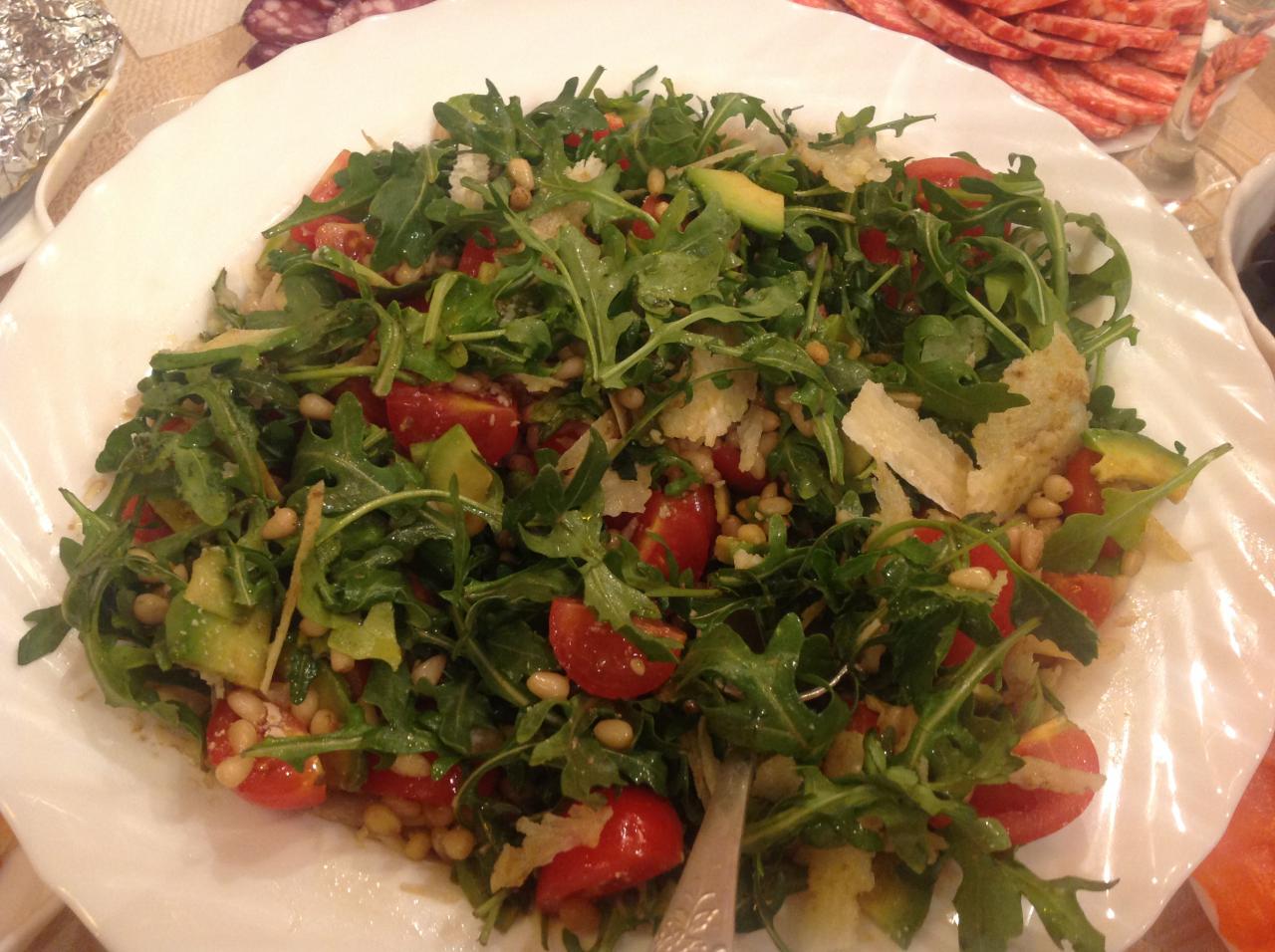 1. С рукколой: 1 пуч. рукколы, 50 г кедровых орешков, 1 авокадо, 200 г помидорчиков черри, полить оливк. маслом + лимон.