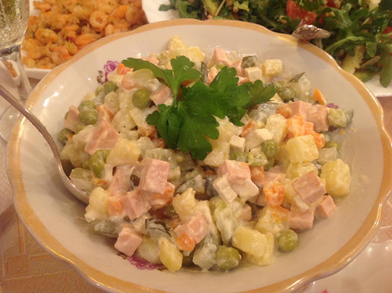 2. Оливье: 3 (отвар.) картофеля, 1 (отвар.) морковь, 2 кислых огурца, 2/3 вареной пшеничной колбасы (я брала классику "Ведрусса"), 70 г белого тофу, 0.5 банки зеленого горошка, соевый майонез, все нарезать кубиками и перемешать)