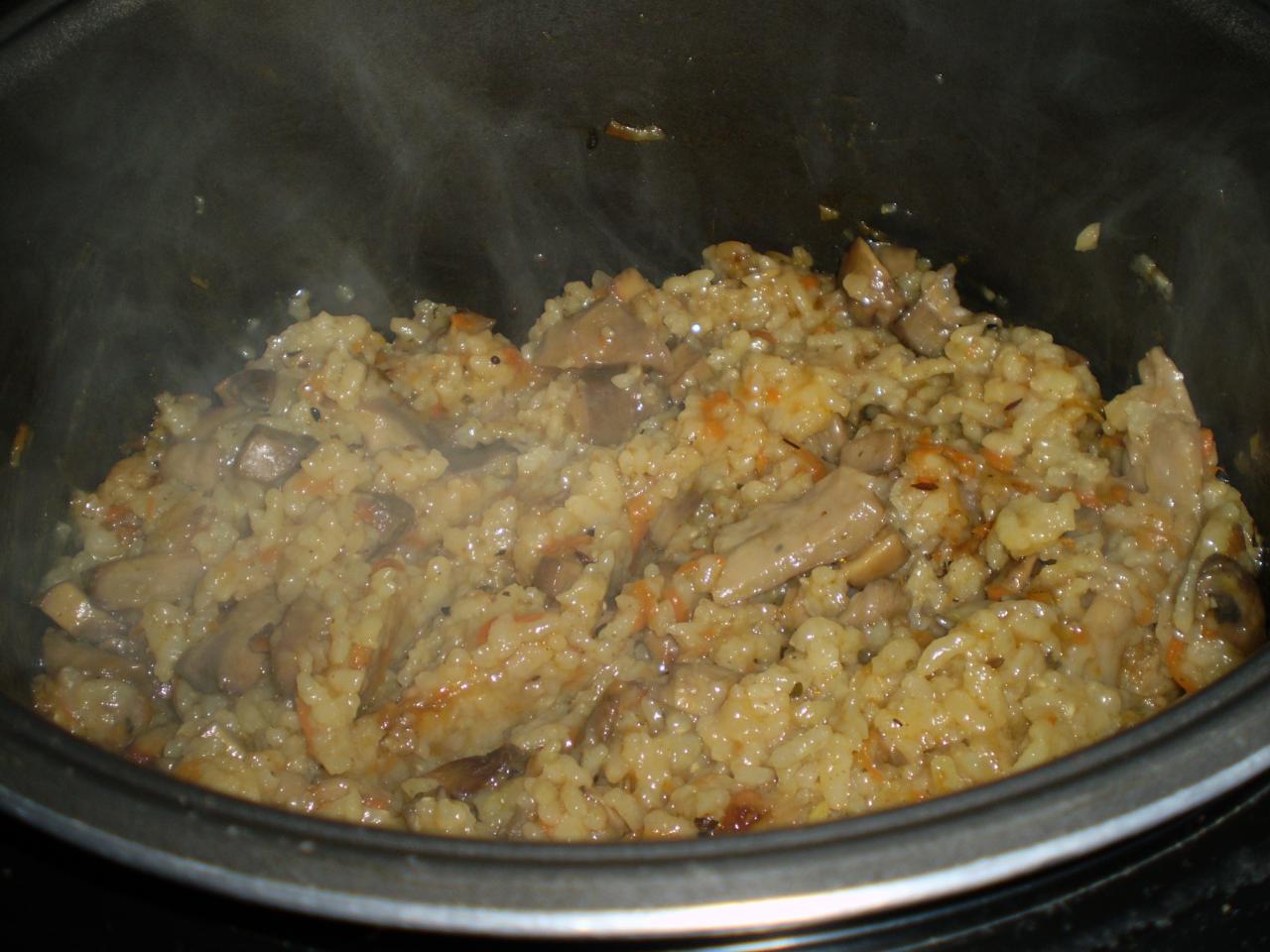 добавила еще грибов и лук порей, но не положила горошек, и вместо рекомендованной чайной ложки масла положила столовую. Длительность программы Рагу не замеряла, но работала она по полной: и чухала пар, и спускала потом, и куковала. Овощи засыпала специями для плова (для собственно овощей почему-то не нашлось), но не солила, посолила потом, как сказано в рецепте. Что сказать: кило-полора овощей в казане на плите без воды и практически без масла без помешивания не утушишь. Кукушке зачет