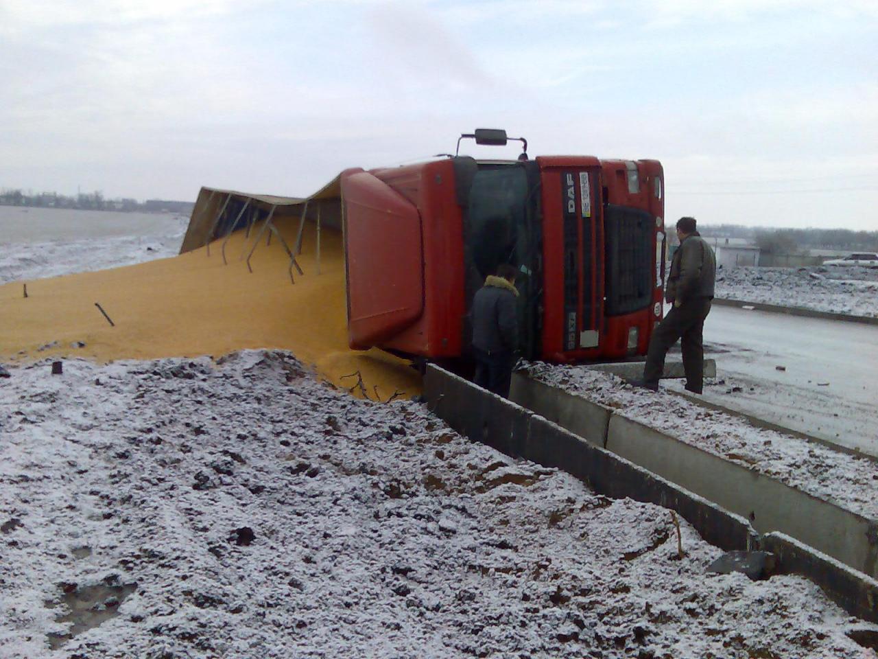 Сегодня утром на въезде в Нерубайское с "Киев - Одесса" на новой развязке перекинулась фура с кукурузой.