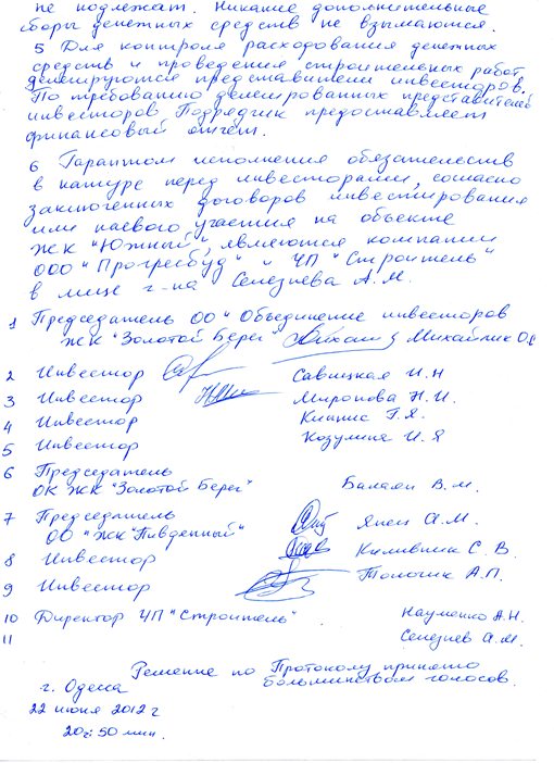 Протокол инвесторы составили и подписали, я не знаю, что это за протокол. Протокол должен был составляться 9 чел., фамилии которых были названы на общем собрании, а не каким-то Академиком, который к инвесторам стройки не имеет никакого отношения. Что вы подсовываете бумагу к которой не имели никакого отношения никто кроме Балаяна и гражданина Одессы. Граждан в Одессе около миллиона и каждый будет писать протоколы, а мы им должны давать оценку?