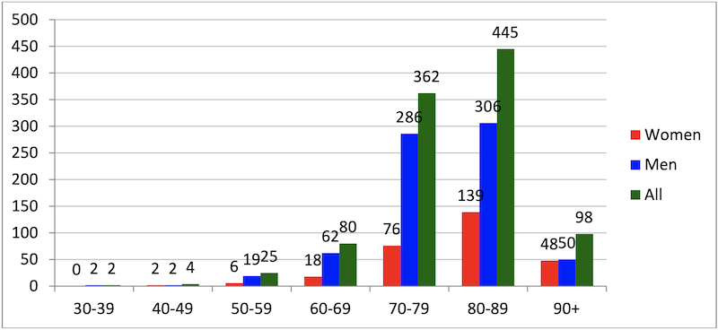 Средний возраст умерших составляет 79,4 года, что примерно на 15 лет выше, чем в целом у инфицированных коронавирусом пациентов.