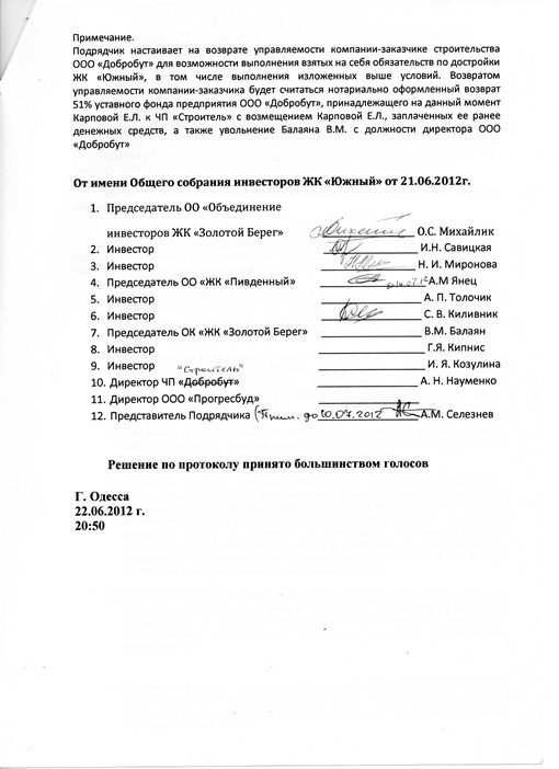 П.С. Не знаю почему не видно на скане, но А. Толочик также подписал Протокол. Т.е. подписали представители большинства инвесторов, боющихся за скорейшую достройку ЖК "Золотой Берег".