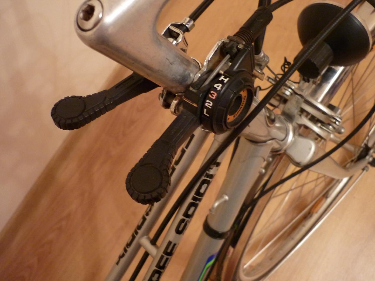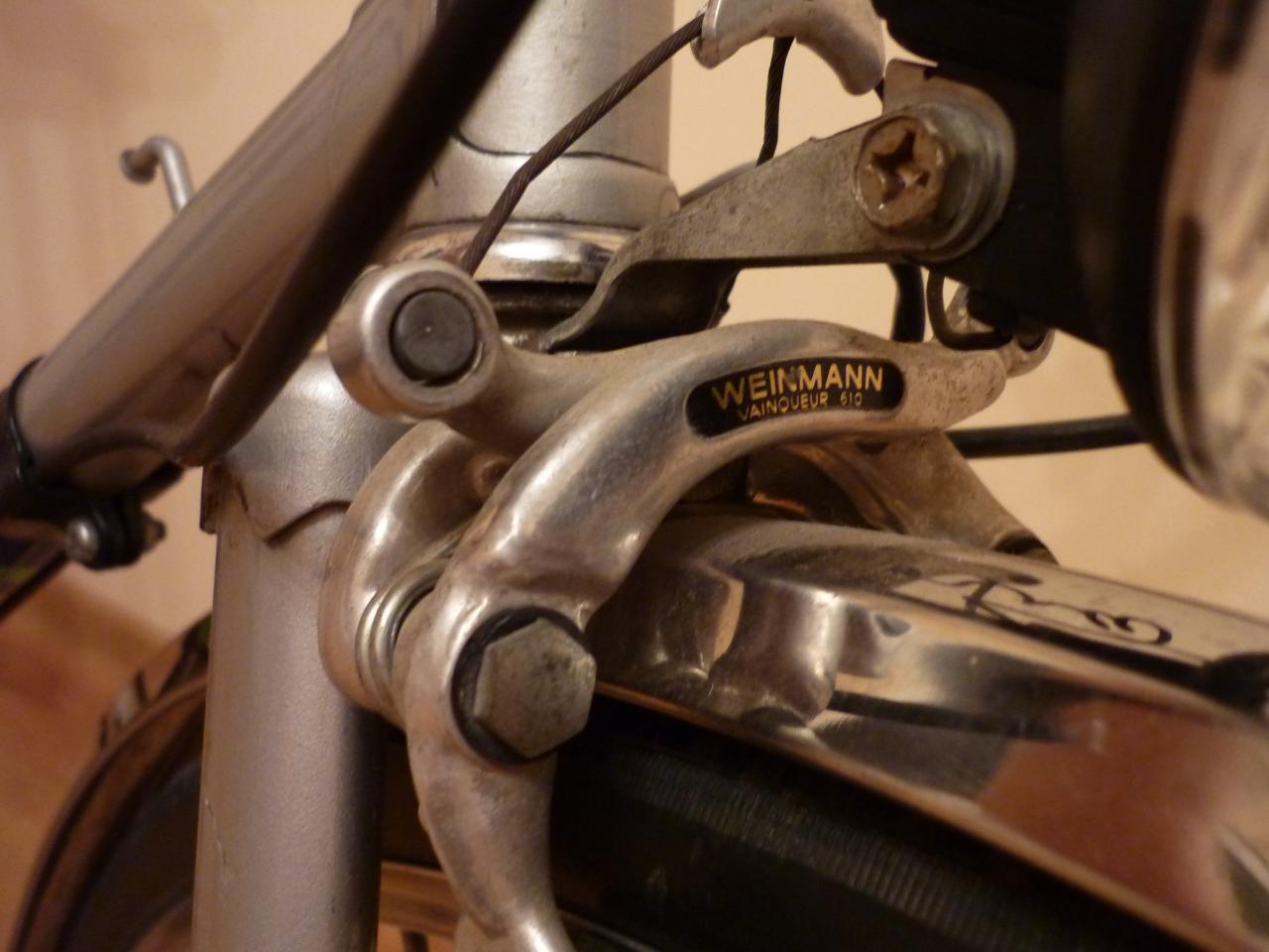 Выкатил сегодня свой после ТО, вечером проветриться. Ощущения двоякие, не сказать странные. Из за специфичной посадки (обратите внимание на руль) и моего любимого Shimano Positron 2х5 поездка превратилась в укрощение строптивой кобылы. Накат замечательный, за счет французских втулок Atom и 27 колес, обода Weinmann, Бельгия и дорожных Schwalbe. Ходовая часть как новая, покрышки без трещин и следов износа, даже колодки с тормозами Weinmann как будто с завода!