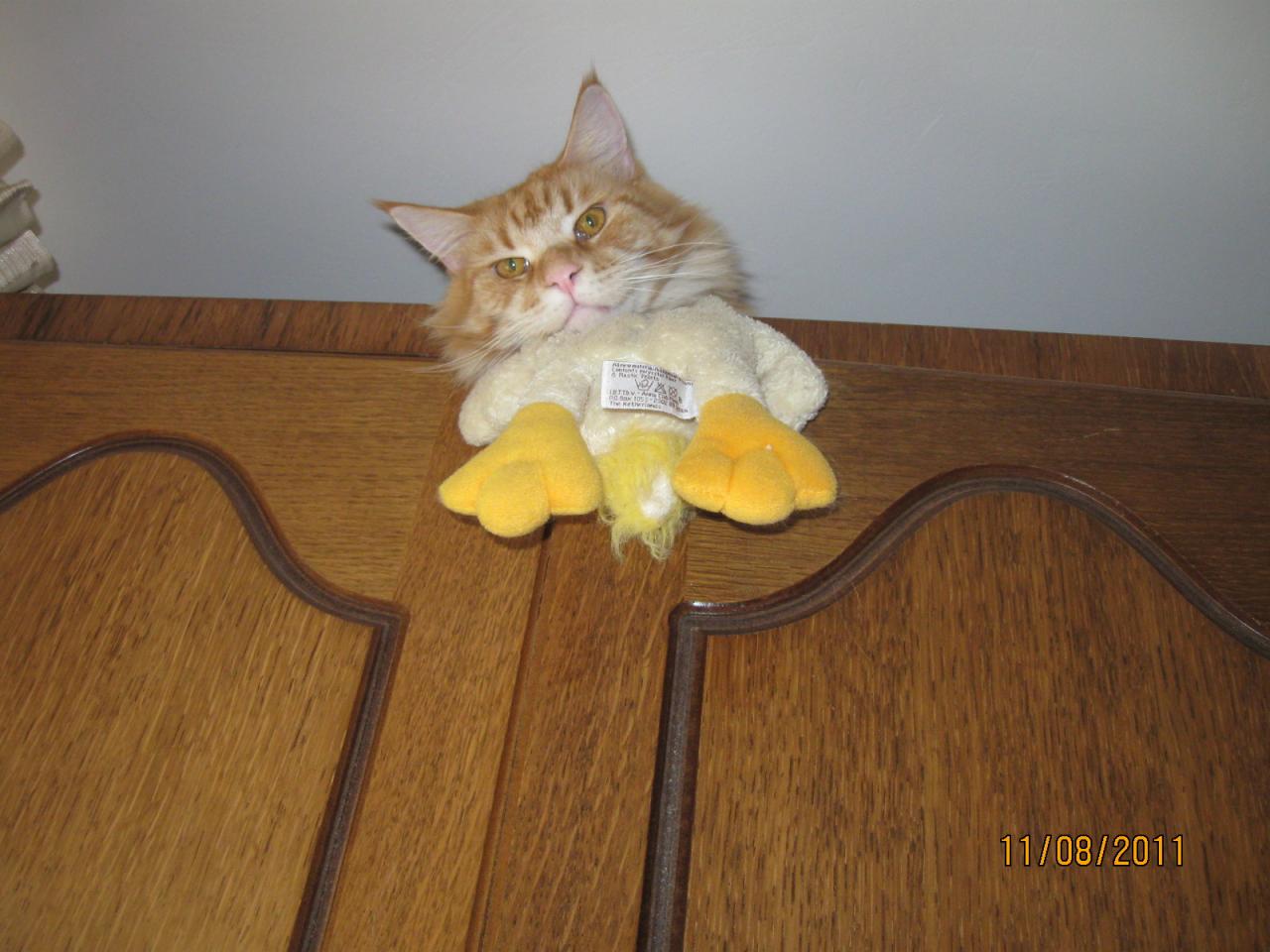 Ого, вот это моська выросла..., а можно котика в полный рост посмотреть))) Это он утку на шкаф вытаскал, или она уже там была?