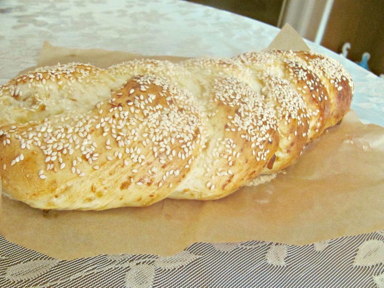 * * *Замесить все инградиенты для теста вместе с сыром и поставить в тёплое место для поднятия...После того как поднялось тесто,вымесить его на столе в муке,до того,чтобы оно не прилипало к рукам,разделить на три части .....каждую часть раскатать в жгут и сплести из них косу....у меня получилась длинная коса,поэтому я по ходу дела её располовинила и получилось две))))выложить косы аккуратно на противень и оставить на 40 мин для поднятия теста...затем смазать сверху белком и посыпать кунжутом, поставить в духовку на 30-40 мин при 220-240 градусов до подрумянивания корочки