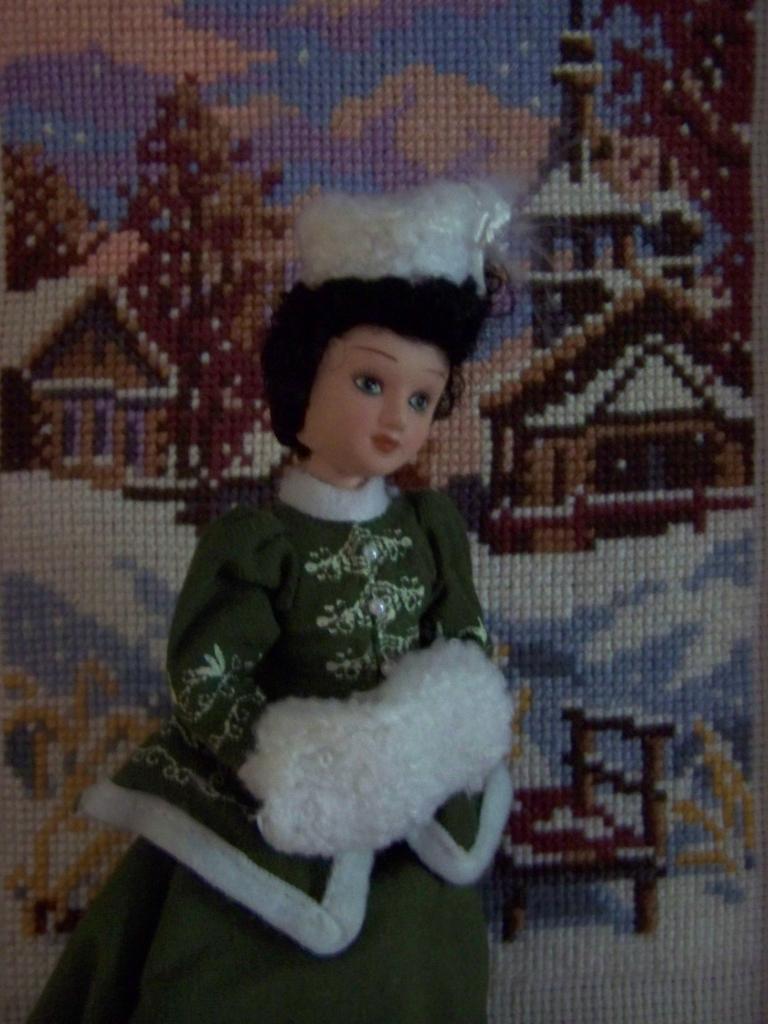 Решила переделать её под "даму 30-х годов", накрасила, пришила серый мех на шляпку, сделала ей бусики.