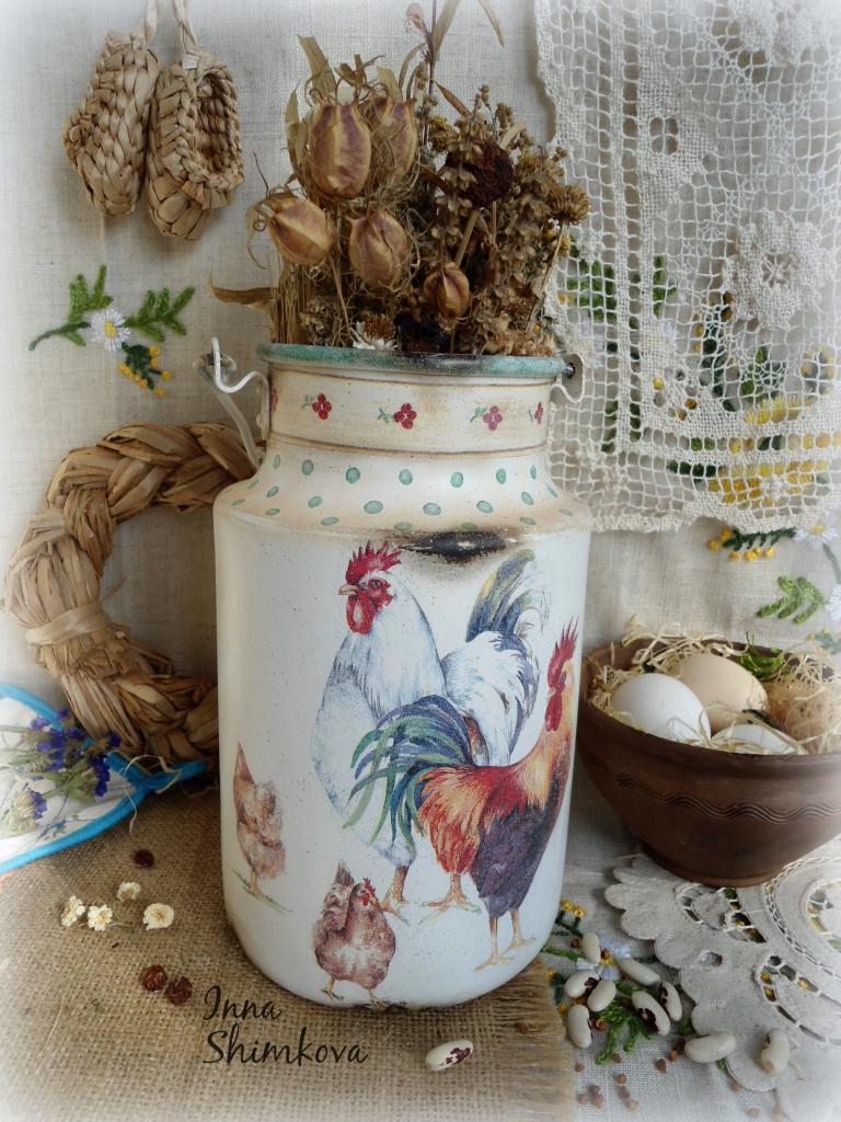 Заказ. Бидончик "Курочки-петушки". Принесли задекорировать в технике декупаж алюминевый старенький и довольно хорошенький бидончик.И получился вот такой красавец в стиле кантри.