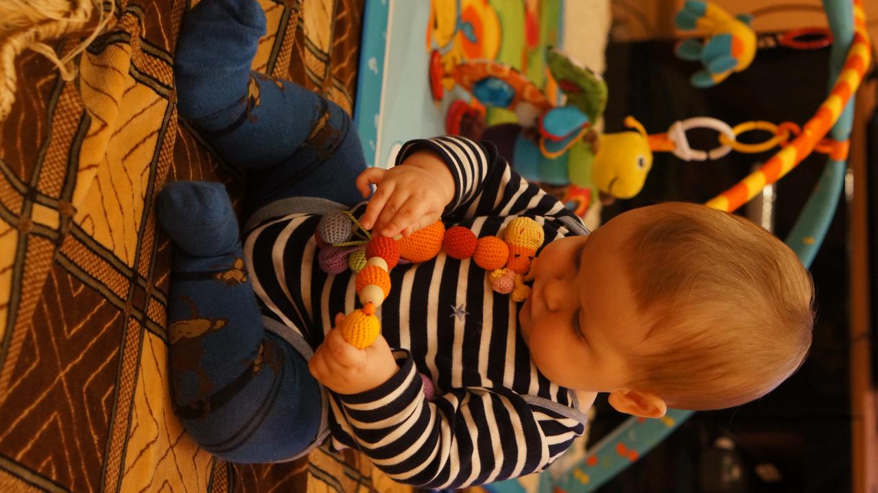 Их можно грызть, когда чешутся зубки, они совершенно безопасны для малышей, поскольку все детали надежно крепятся на вязаный шнурок.