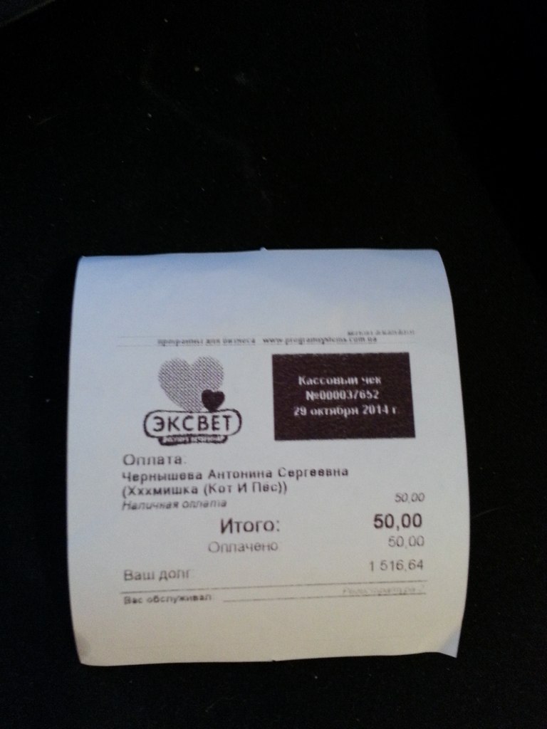 Тонь, сейчас по дороге домой зашла в Эксвет - занесла 50 грн в счет погашения долга по Мишке. Вот чек, почему-то остаточный долг 1516 грн. А раньше был 1514 по твоим сообщениям. Или это твой общий в клинике?