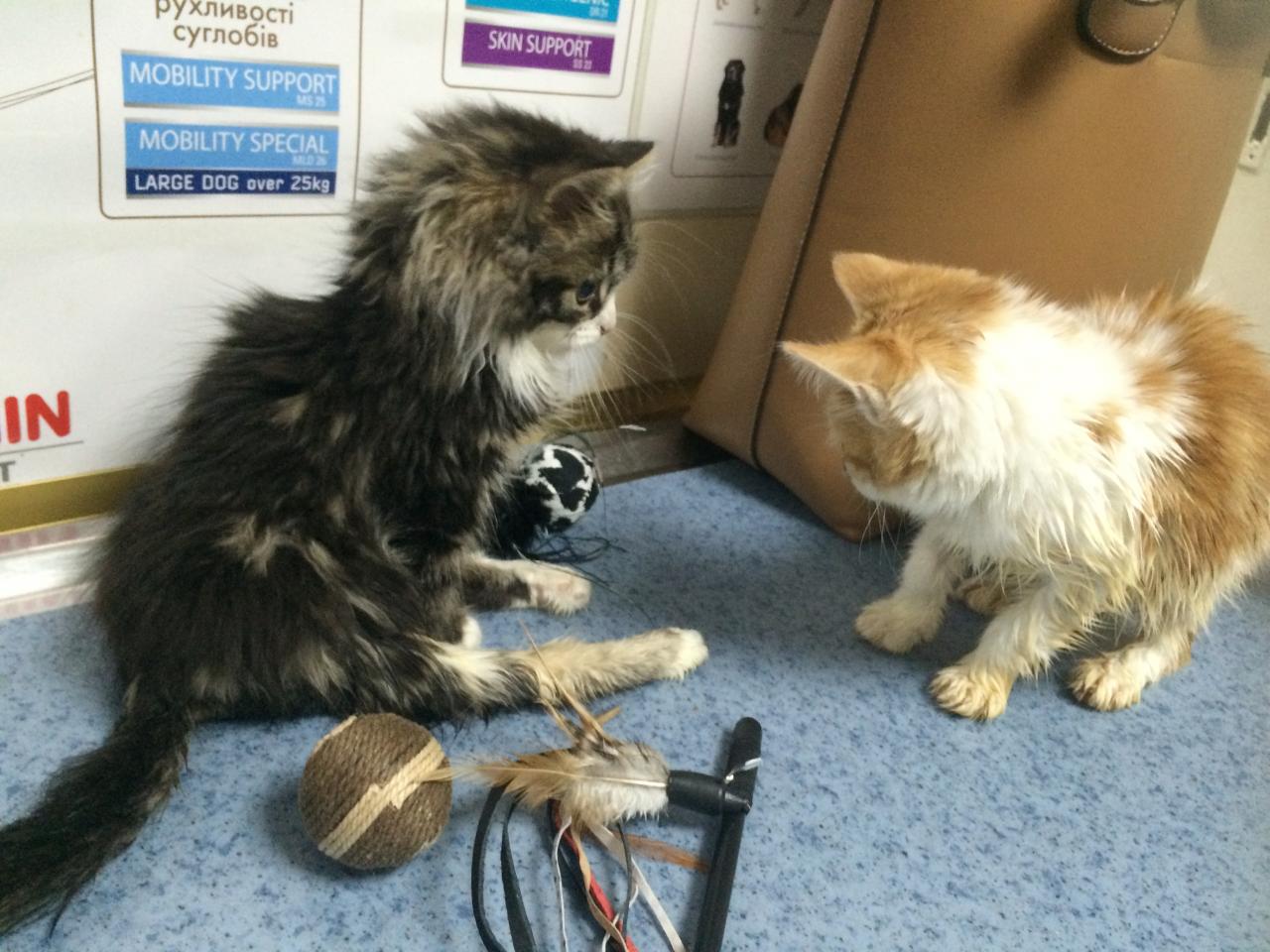 Сегодня вечером я проведала Клычка и Огонька) Принесла пачку сухого корма и еще много мокрого корма в пакетиках, пусть оба кушают и набираются сили принесла два мячика для малышей и такую прикольную "метелку")))ну чтоб гоняться за ней и кусать))))