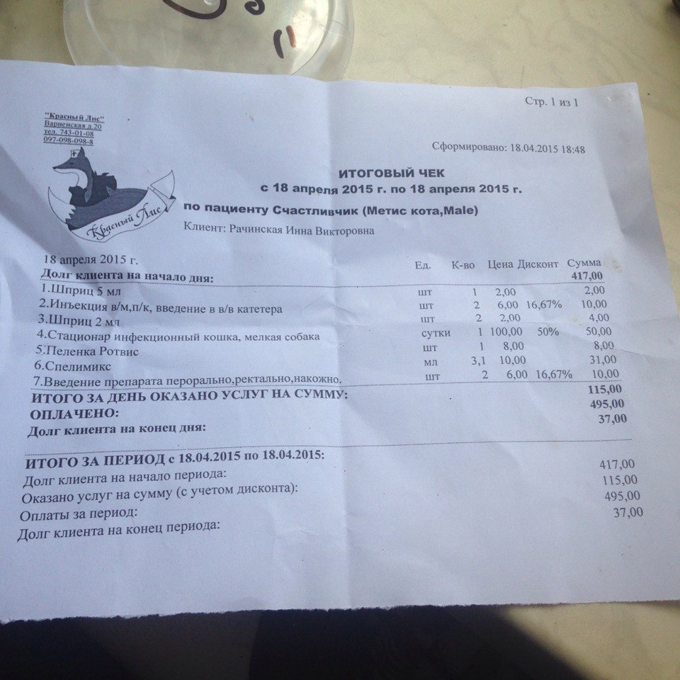 Спасибо!!!Грустный...был перерыв из-за расстройства, но потом снова продолжили колоть два антибиотика. Он бедный так натерпелся на улице, что сейчас принимает все процедуры как должное. С воскресенья уже на передержке, где продолжает получать уколы. Долг в клинике 37 грн. закрыла сегодня, чек не взяла, спешила.