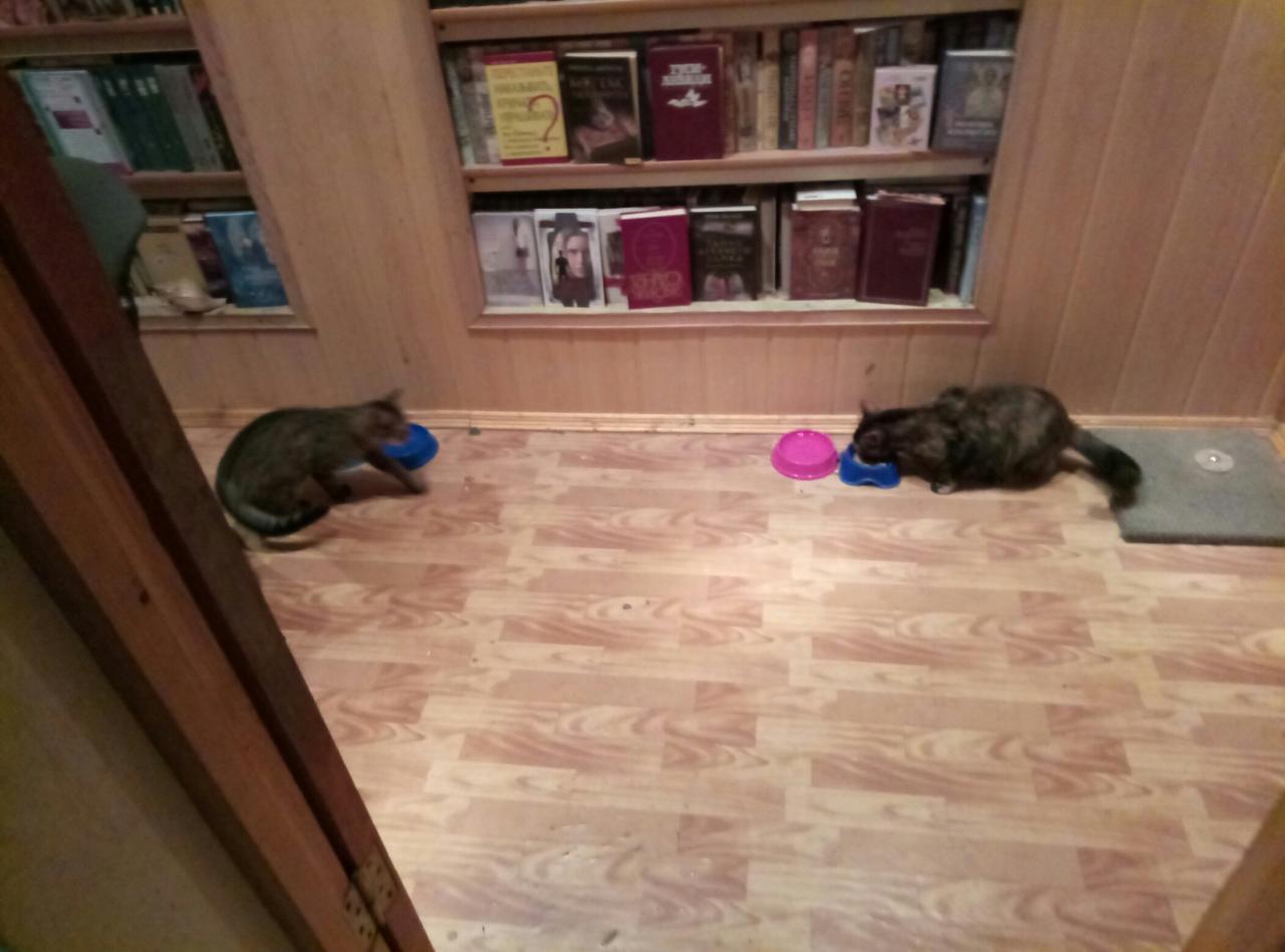 А вторая миска Кексова просто в кадр не попала. Кексик, кстати, старается везде успеть (первое время Фиону закрывали в другой комнате, чтобы она спокойно покушала).