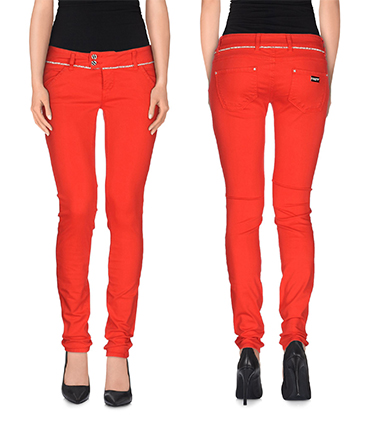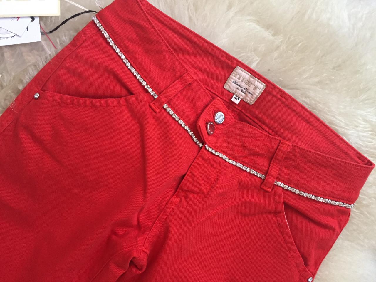 Не тянутся хотя в составе 2% эластан/98 коттон. Со стращами по поясу, на карманах, фирменное лого. Ярко алого цаета, узкие.