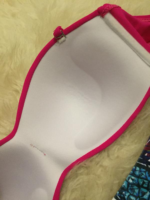 Малиновый верх, внутри поролоновые вставки литые на размер груди 75В-75С. Длина чашки 32 см, длина вся по объему 73 см.