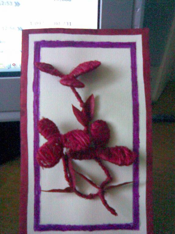 цветок сделан из ниток напоминающих немного леску и каркаса из нержавейки плюс лепестки из специальной бумаги, ну и ночью открытка светится)