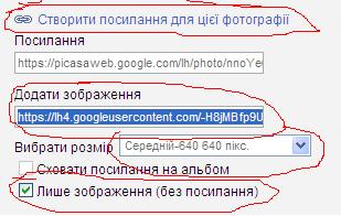 выбираете фотку, справа есть меню, там надпись - "Створити посилання для цієї фотографії" Нажимаете ее. Ставите галочку - лише посилання и копируете ссылку из поля с надписью "Додати забраження". Получаете ссылку вида https://lh4.googleusercontent.com/-H8jMBfp9UjY/T0x0XVsit3I/AAAAAAAAA68/h4Fo4F1QoLY/s640/DSC_3567-DSC_3569.jpg
