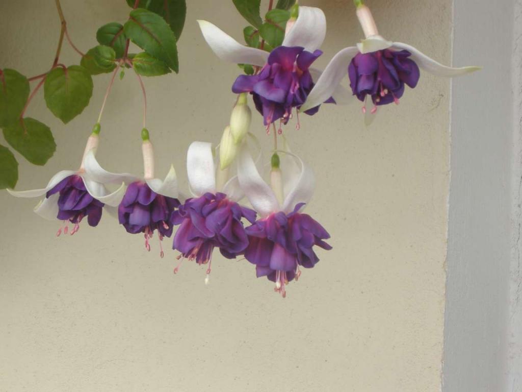 Свои фуксии в середине мая переселила на открытую С-В лоджию. Повесила так, что бы лучи солнца не попадали на них. Пока один сорт цветет.