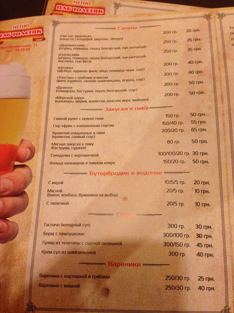 Паб «Толстяк». (Бар, рюмочная, что-то такое). Маленькое помещение, достаточно уютное, чистое, есть выбор в меню, цены на спиртное нереально низкие, ну обычное дело для подобных мест.