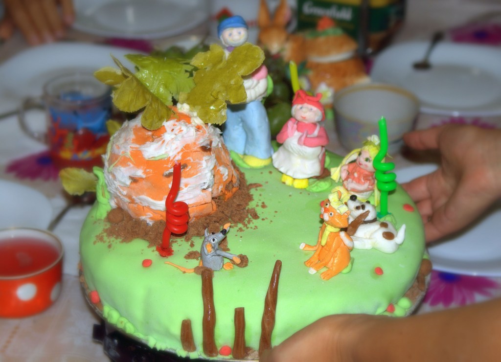 Мячик я вложила в кожуру от апельсина и облепила картошкой. В общем, делать надо было не так))))), потому что печенье сползало с кожуры и мастика трескалась. Дед и кот у меня вышли переростками, наверное, бабка их подпаивала теми же удобрениями, что и репку.). Повезло, что мои гости неискушенные в тортах с мастикой, поэтому прокатило
