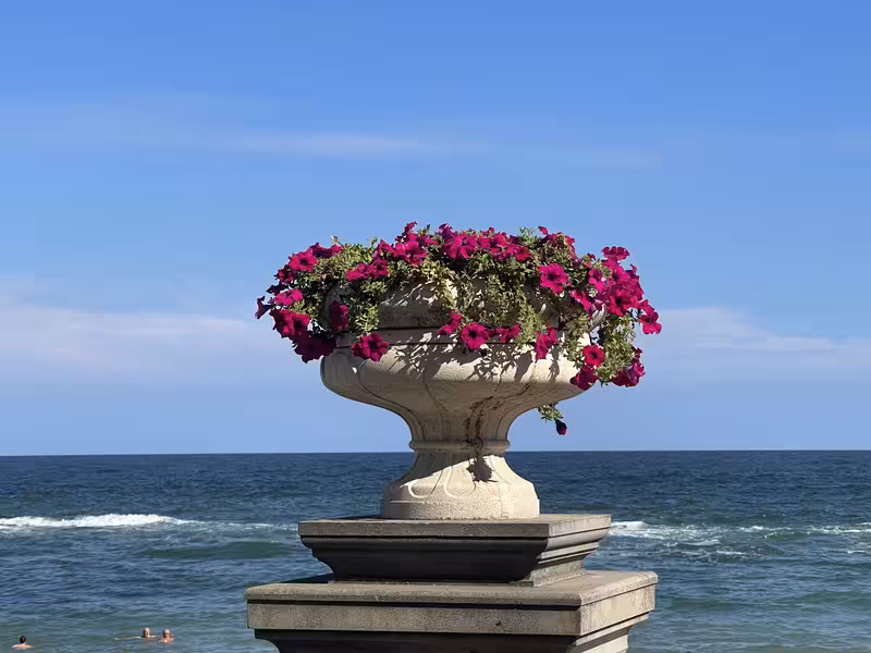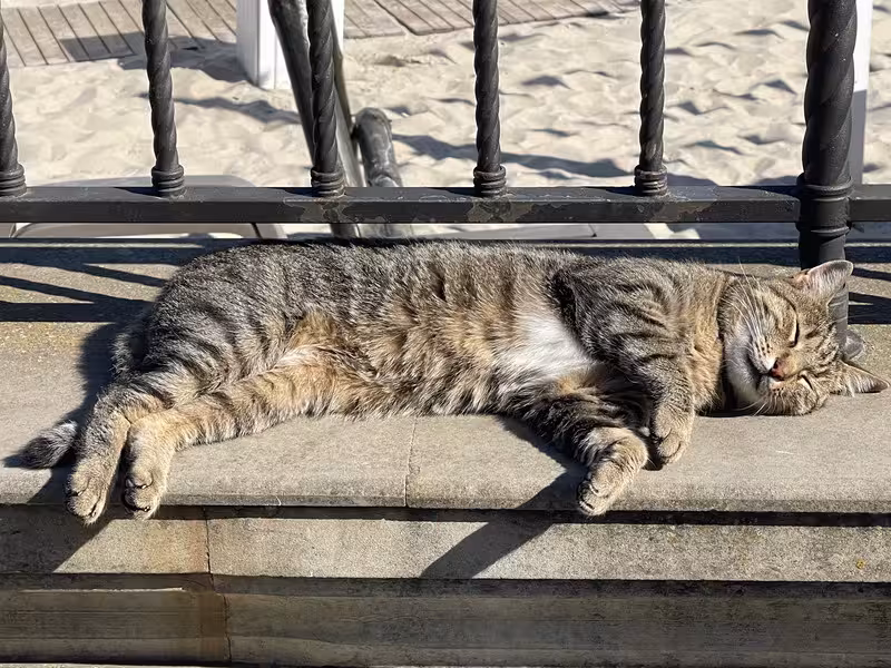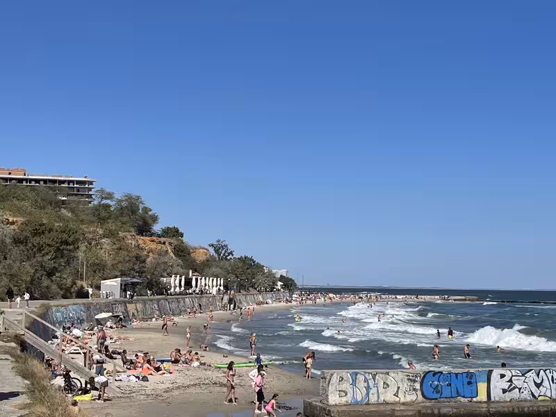 Хвилі з'їли пів пляжу, примостилася за Ротондою, так собі, хто засмагає, хто в куртках шастає. Море чудове, шумить гарно так і тут опа - з Ротонди як вріже Рамштайн, триндець, мало не оглохла(
