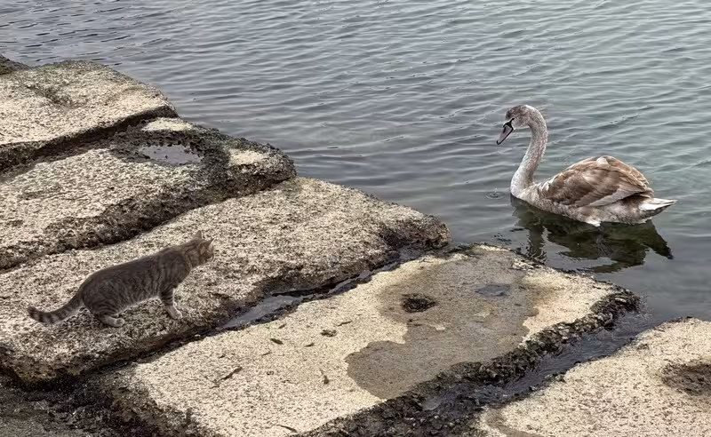что то кошеня выясняло с лебедем, лебедь очень громко шипел
