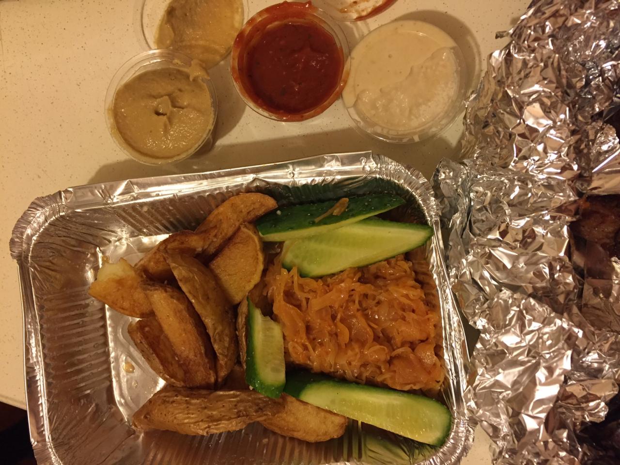 Баранья лопатка, колбаски-гриль (баранина, курица), челагач свиной, шашлык свиной+ 3 разных соуса, картошка запеченная и капуста по баварски.