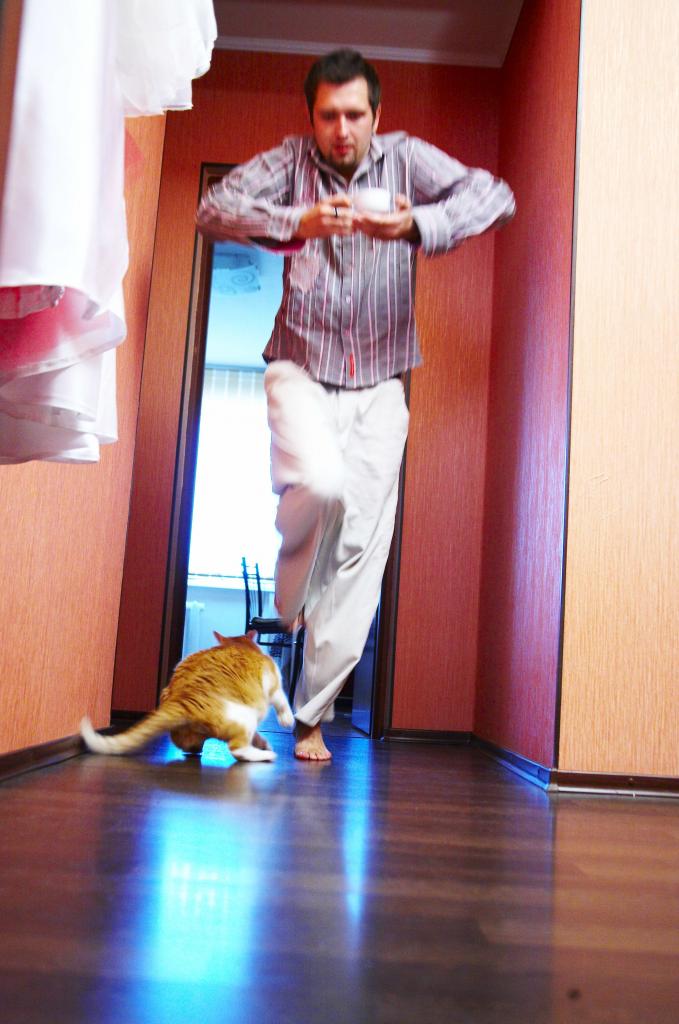 Недавно удалось запечатлеть мужа перед полётом, споткнувшегося о кота-любимца )))