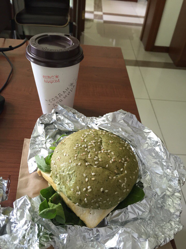 Продолжаем есть вкусную и полезную еду. В этот раз Вегано Хулигано. До Старопортофранковской не доехали, заказали доставку. На фото фирменный бургер Грин с тофу, шпинатной булкой, рукколой и много еще чем. Вкусно и легко. И латте с миндальным молоком - приятный вкус, но чувствуются мелкие фракции миндаля )