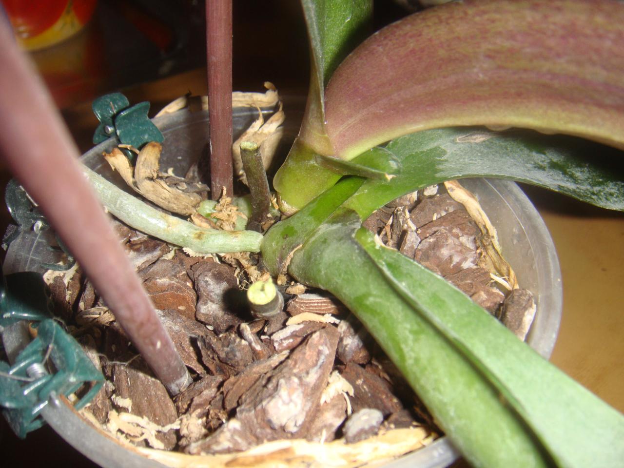Девочки подскажите пожалуйста "чайнмку"!Подарили орхидею, а она пустила "отросток" и не пойму то ли это детка, то ли новые листья?!И подскажите пожалйста, как бы лучше корни почистить???