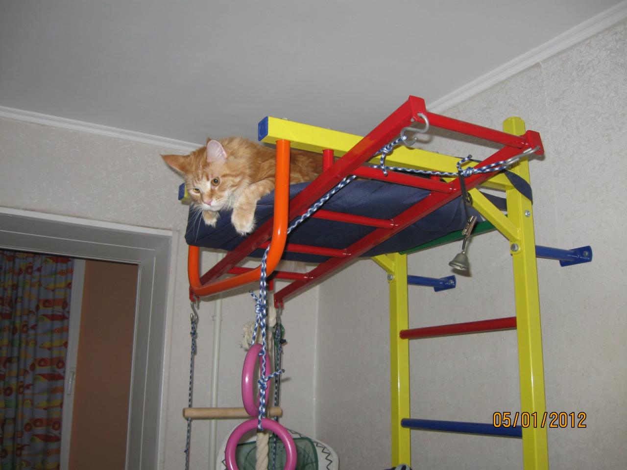 Энжик встаёт в 3.30. Каждый день. Ему надо в туалет. За год и три месяца нашего совместного проживания он придумал бесчисленное количество способов будить меня с это недетское время: укладывание на голове в виде шапки и качание на скрипучей гладильной доске, прыжки на телевизор и ковыряние в письменном столе, поедание кулька и хозяйской руки ... всего и не упомнишь. Пару месяцев назад я, заметив за животиной стремление к созданию собственного гнезда, закрепила на детской спортивной стеночке сумку для переноски младенчиков. Котя была счастлива. Я тоже. До тех пор, пока от большого ума не повесила колокольчик при входе в его квартиру. Теперь Энжик не утруждает себя изобретением нового неожиданного способа как поднять весь дом на уши, а лёжа у себя в халабуде звонит дворецкому до тех пор, пока он, т.е. я не встану и не пойду с котом в туалет. Ну, смех и грех с этой торбой мохнатой!