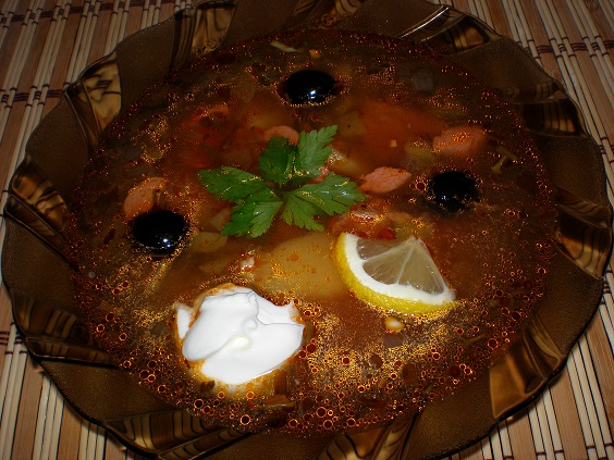 Мясо варится до готовности с лавровым листом,душистым перцем,перцем горошком.Если есть корни петрушки -добавляйте в бульон.Еще я добавила 2 картошки.Кто не любит-не кладите.Затем минут через 10 после того,как мы поставили зажарку, добавляем в неё 3-4 огурчика солёных мелко порезанных.Я не снимаю кожуру.А рассол от огурцов и от маслин по пол-стакана того и другого отправляем в бульон.Бульон я не солю до последнего,потому что можно запросто пересолить.В бульон добавляю специи и чёрный перец.Теперь все содержимое сковородки отправляем в кастрюлю и немного провариваем.Лаврушку выкидываем,пробуем на соль,добавляем петрушку,дольку мелко-порезанного чеснока.Выключаем.В тарелку с солянкой кладём 3-4 маслины,дольку лимона и сметану.Смачного!!!