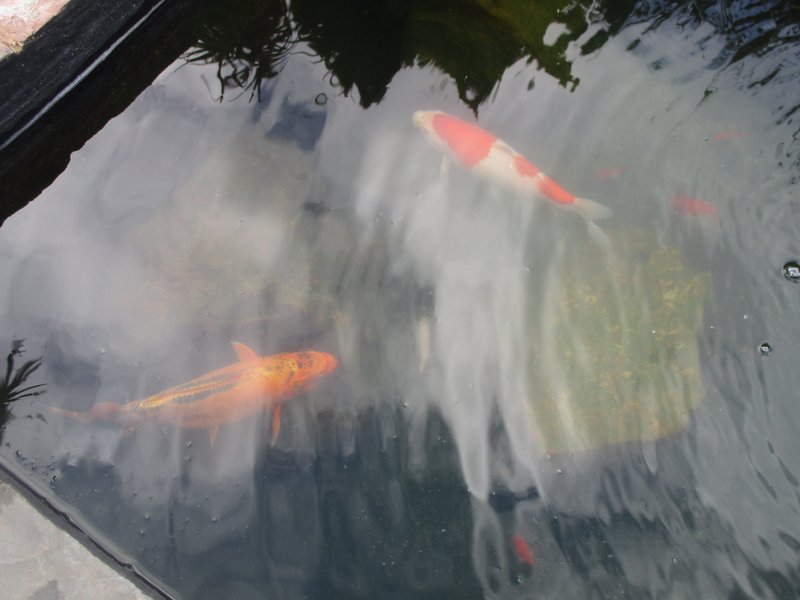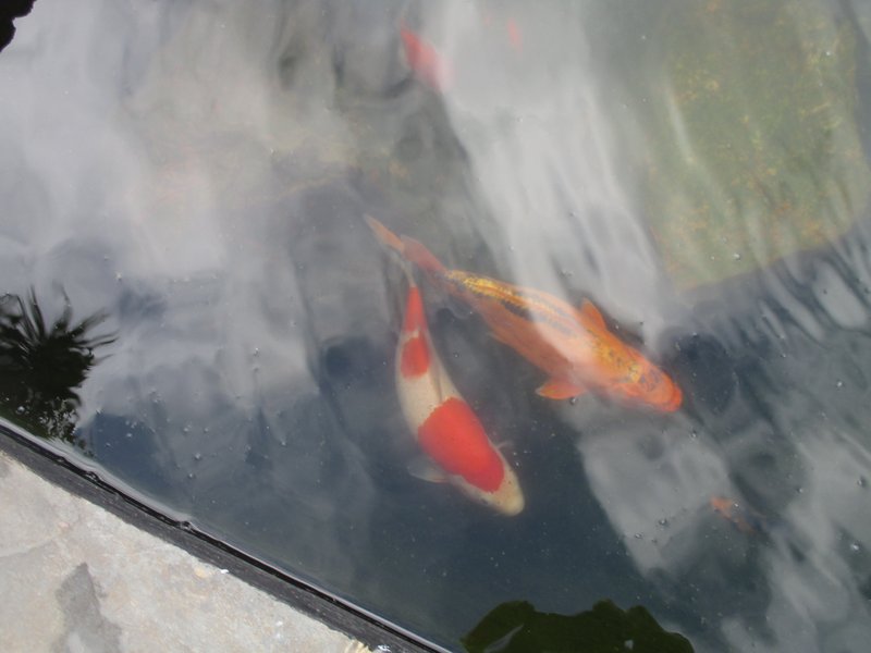 Кусочек моего пруда с японскими карпами кои. Эти две рыбёхи здоровенные, тяжеленные, у них там десятка два годовалой малышни плавает ))).