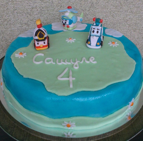 Шоколадный бисквит, вишневая прослойка, сметано-йогуртовое суфле, украшен белковым кремом, фигурки из сахарной мастики, вес 3 кг.