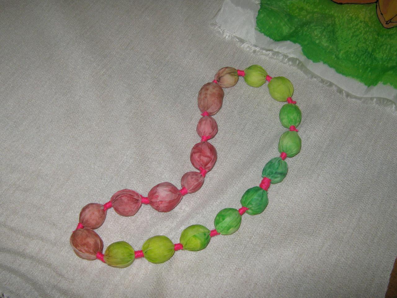 Действительно, очень ярко и можно сделать под шарф из батика. Можете взять обрезки от расписанного вами шарфа или платка шириной 5 см и длинной 65 см или другой в зависимости от желаемой длинны бус. Или расписываем шелк в той цветовой гамме, которую хотим. Сшиваем по длине. Во внутрь зашьем бусины, мы делаем из валяной шерсти, они легкие.Перетягиваем цветной нитью или можно опять же бусины. Вообщем, фантазировать можно бесконечно.