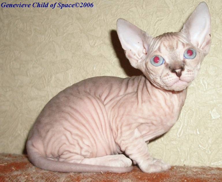 Если интересно, можете почитать здесь:"Если вы способны представить себе мордочку, увенчанную огромными ушами и с глазами инопланетянина, дополнить к этому портрету загривок жирафа, нежный животик маленького поросенка, хвост Крысиного короля, пальцы обезьянки с ящеркиными перепонками, и в довершение картины - одеть все это в кожанное или замшевое на вырост одеяние, которое образует множество складочек, тогда получется сюрреалистический образ загадочного сфинкса".![]()