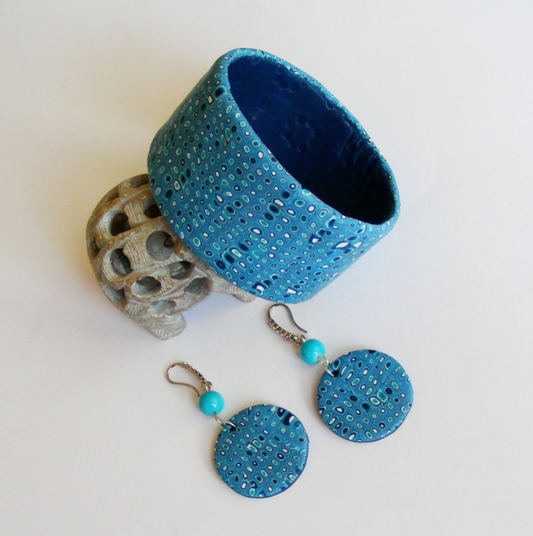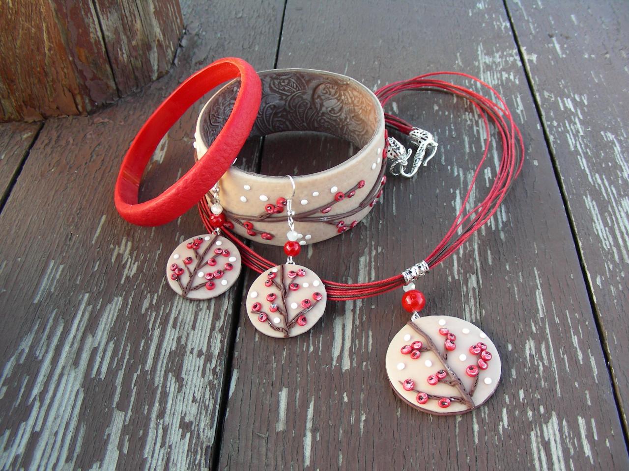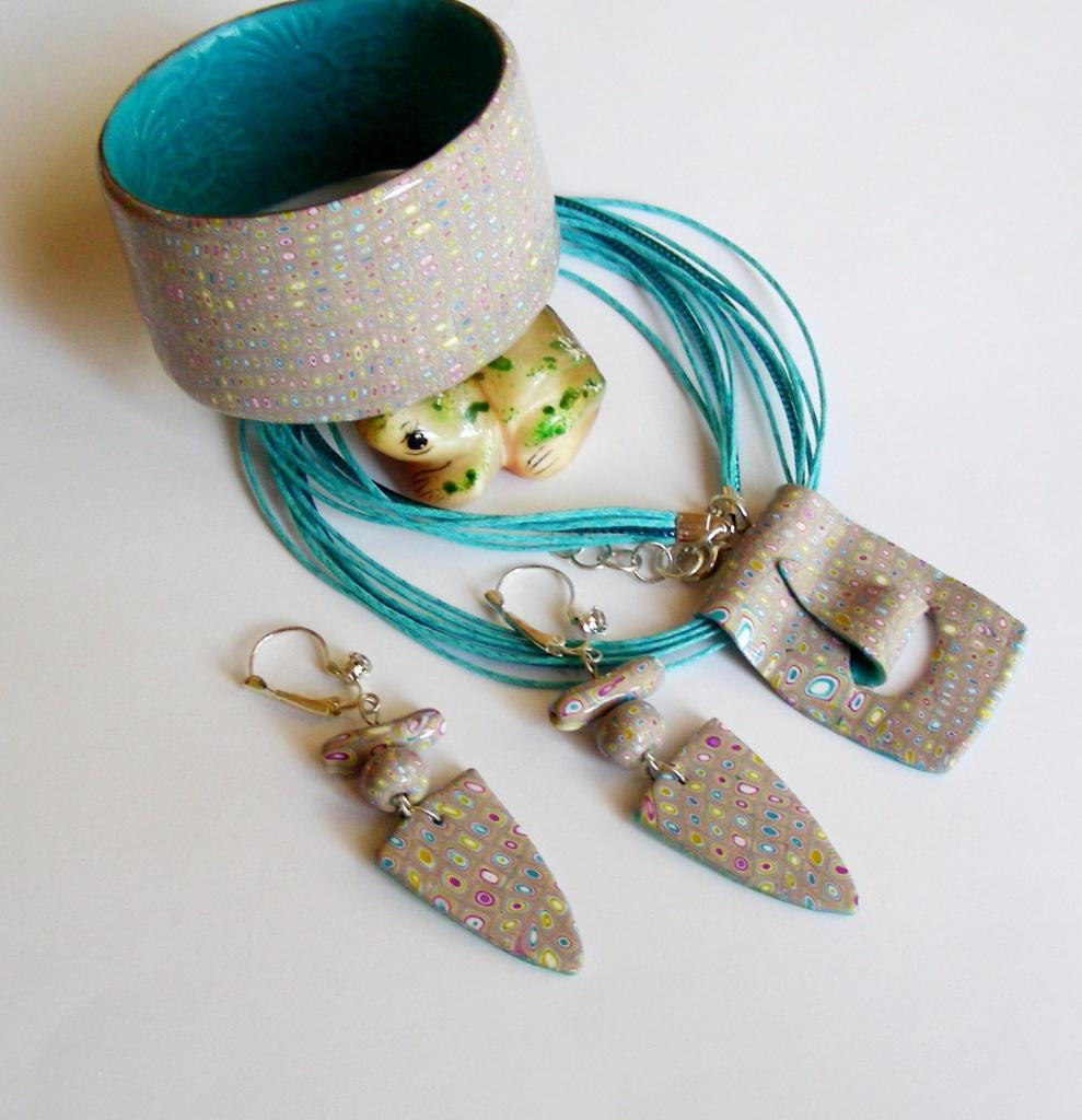 Украшение ручной работы. Выполнено из запекаемой полимерной глины. Изделие не боится воды. Размер браслетов 7 см по внутренней стороне. Длина подвески 50 см. Длина сережек 5 см. Цена комплекта 550 гривен.