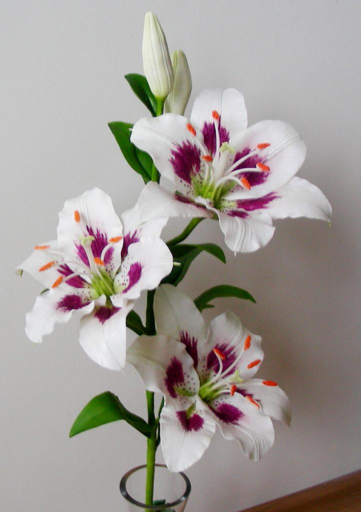 Ветка с лилиями. Лилии выполнены из холодного фарфора. Тонированы масляными красками. Каждый лепесток выполнен в ручную. Возможно исполнение в другом цвете. Цветы никогда не завянут и долгое время будут радовать вас. Прекрасный подарок на любой случай. Уход сухая чистка кисточкой. Цена -800 гривен.