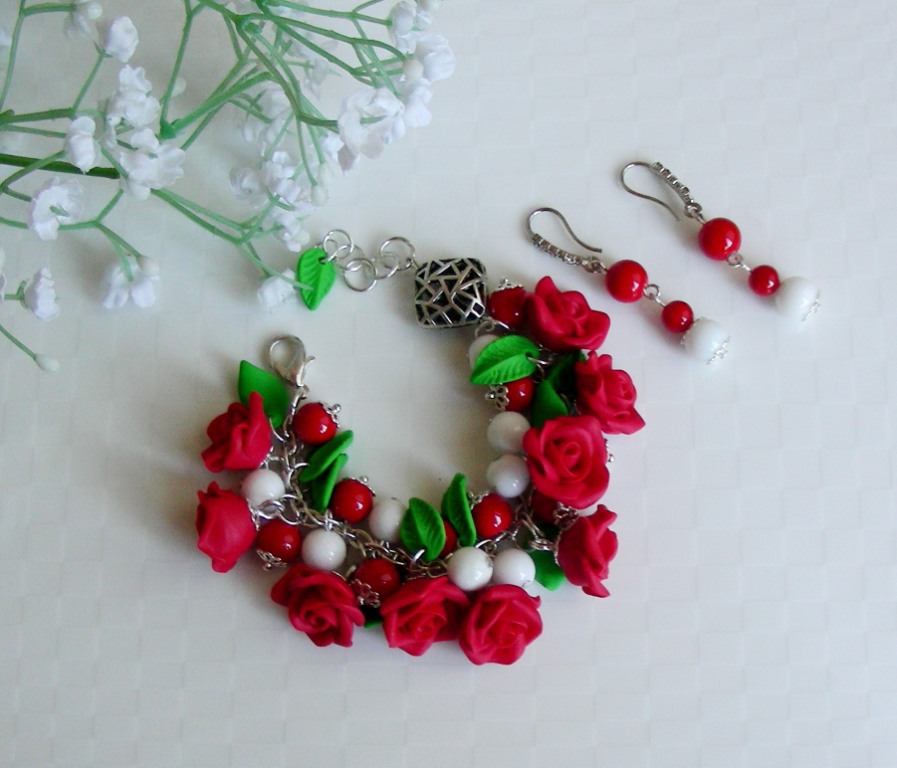 Комплект выполнен из полимерной глины. С добавлением натурального белого агата, натурального коралла. Размер браслета регулируется. Цена комплекта 400 гривен. Уход бережное отношение.